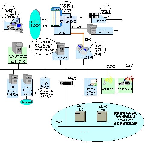 在深圳國稅局方案中,整個系統(tǒng)的建設(shè)按三期規(guī)劃進行。第一期的目標(biāo)主要是搭建呼叫中心平臺,包括ACD(排隊機)、IVR(交互式語音應(yīng)答系統(tǒng))、CCS(華為呼叫中心中間件)等軟硬件設(shè)備。ACD作為整個系統(tǒng)的核心接入設(shè)備,采用了華為公司的C&C08-Q排隊機。C&C08-Q是大容量高可靠性的數(shù)字排隊機,通過中國七號信令或ISDN