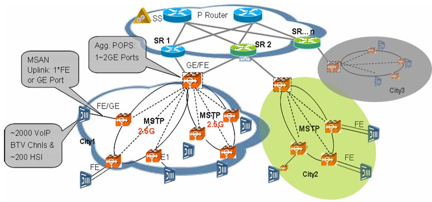 MSAN已經(jīng)逐漸成為基于IP架構(gòu)的下一代電信網(wǎng)建網(wǎng)的主要接入方式,近幾年越來越多的固網(wǎng)運(yùn)營商普遍采用綜合接入(MSAN)建網(wǎng)模式,如英國的最大固網(wǎng)運(yùn)營商英國電信的21CN網(wǎng)絡(luò),中國的最大固網(wǎng)運(yùn)營商中國電信、中國網(wǎng)通,巴西的最大固網(wǎng)運(yùn)營商Telemar等。而MSTP單一平臺具備支持MSAN接入的所有業(yè)務(wù)的承載要求,且成本最低。華為公司MSTP設(shè)備具有強(qiáng)大的數(shù)據(jù)接入?yún)R聚及傳送特性,并通過Metro