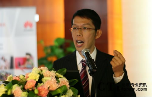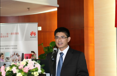 圖:華為軟件UC產(chǎn)品總監(jiān)許國(guó)華做“攜手邁入全業(yè)務(wù)融合時(shí)代,助力企業(yè)騰飛”的主題演講