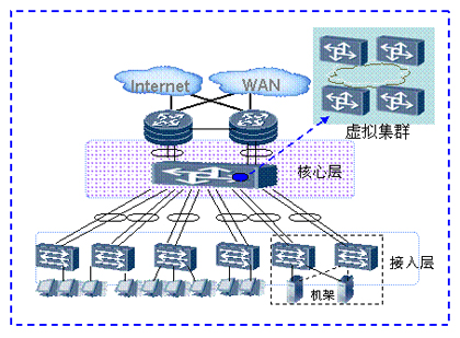 如上圖所示,整個數(shù)據(jù)中心網絡通過虛擬集群技術,多個核心層設備虛擬為一臺設備。通過增加核心節(jié)點,提供無阻塞的網絡能力,接入更多服務器。服務器的規(guī)?梢詮3000臺“無級擴展”到數(shù)萬臺。在滿足企業(yè)日益增長的業(yè)務需求的同時,并不增加網絡的復雜度,減少管理和維護的成本。