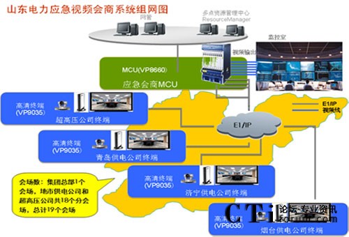 山東電力集團(tuán)公司為了開(kāi)展應(yīng)急視頻會(huì)商業(yè)務(wù),需建設(shè)一套覆蓋集團(tuán)總部、地市供電公司、超高壓公司等19個(gè)單位的視訊系統(tǒng),并能夠與國(guó)家電網(wǎng)、地市供電公司已有系統(tǒng)實(shí)現(xiàn)音、視頻的互通。
