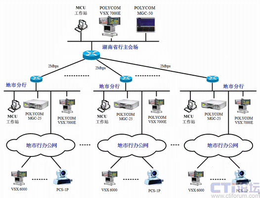 在株洲、邵陽和永州市行采用級(jí)聯(lián)的方式來實(shí)現(xiàn)。具體實(shí)現(xiàn)方式為:VSX 7000E則和地市行的MGC-25通訊,并且MGC-25負(fù)責(zé)其縣支行終端的接入,同時(shí)用MGC-50和MGC-25的端口級(jí)聯(lián),采用這種連接方式就可以實(shí)現(xiàn)從省行-地市行-縣支行的三級(jí)網(wǎng)視頻會(huì)議的召開。