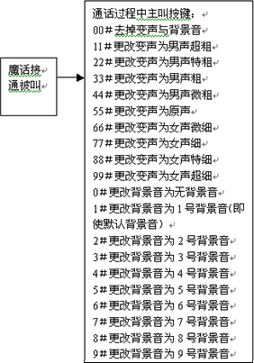 變聲通話功能也叫魔話功能,是指用戶通過通過播打特殊的號(hào)碼接入到本平臺(tái)后,再通過本平臺(tái)去呼叫最終的被叫用戶,在這樣的一個(gè)通話過程中,可以通過本平臺(tái)提供8級(jí)變聲和原聲功能:“男聲超粗、男聲特粗、男聲粗、男聲微粗、原聲、女聲微細(xì)、女聲細(xì)、女聲特細(xì)、女聲超細(xì)”。在通話過程中實(shí)時(shí)變聲,并可按鍵選擇改變變聲系數(shù)或恢復(fù)原聲,趣味非凡,超常體驗(yàn)。
