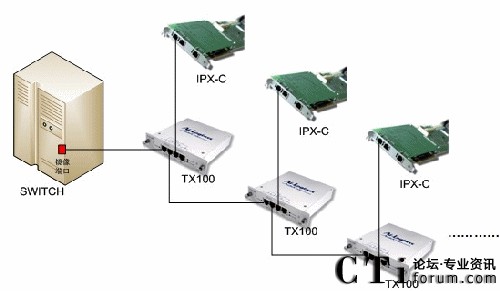 將TX100直接高阻搭接在網(wǎng)絡(luò)中的任何位置,兩個(gè)Network端口高阻搭接在主干網(wǎng)上,另兩個(gè)端口Monitor A和Monitor B將上行數(shù)據(jù)流和下行數(shù)據(jù)流轉(zhuǎn)發(fā)至IPX卡上。