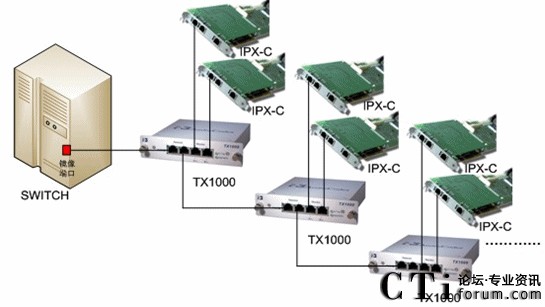 將PBX或網(wǎng)絡Switch的鏡像端口連接到TX1000的Network口,另一個Network口和Monitor 端口就可將一個端口的數(shù)據(jù)備份成三個端口的數(shù)據(jù),實現(xiàn)了一分三的功能。若再接一個TX1000,就可以繼續(xù)分用,以此類推,根據(jù)各個IP應用中實際所需的備份/分用,TX1000都可予以實現(xiàn)。