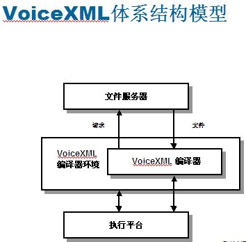 VoiceXML設(shè)計的工作原理:語音應(yīng)用程序作為系列頁存儲在類似于網(wǎng)絡(luò)服務(wù)器的文件服務(wù)器上。從實(shí)現(xiàn)平臺接收到輸入呼叫時,VoiceXML編譯程序會向文件服務(wù)器發(fā)出一個特定URL請求,就像用戶瀏覽網(wǎng)絡(luò)時輸入網(wǎng)站地址一樣。文件服務(wù)器可以與編譯程序直接相連,也可以設(shè)置在外部,通過本地網(wǎng)或互聯(lián)網(wǎng)的IP協(xié)議訪問。他們可以保持應(yīng)用程序的服務(wù)邏輯,可以提供數(shù)據(jù)庫查找與其他系統(tǒng)操作功能。