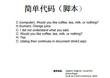 世界上最古老的用戶界面--人類語言終于在二十一世紀(jì)借助于VoiceXML,一種語音可擴(kuò)展標(biāo)記語言發(fā)展成熟起來。作為世界上第一個真正的語音通信標(biāo)準(zhǔn),它定義了應(yīng)用開發(fā)商向用戶提供新型信息訪問服務(wù)的方式。通過這種服務(wù),用戶在任何地方,都可以通過電話或任何移動設(shè)備,虛擬訪問任何信息。VoiceXML正在被廣泛應(yīng)用于旅游、金融與信息服務(wù)等行業(yè)的各種業(yè)務(wù)領(lǐng)域中,甚至是政府部門與市政機(jī)構(gòu),全球的無線運(yùn)營商等。