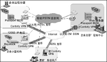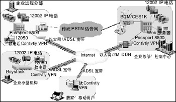 在企業(yè)網(wǎng)上加載北電網(wǎng)絡(luò)話音設(shè)備(BCM,CSE1K或ITG/M1),再配合上北電網(wǎng)絡(luò)的IP電話i2002/i2004,或在移動用戶的PC上安裝i2050