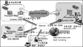企業(yè)總部/數(shù)據(jù)中心基本采用DDN專線或租用以太網(wǎng)鏈路連接到本地服務(wù)提供商(ISP),此時Contivity (Contivity 4600/5000)獲得固定的合法IP地址,大型遠程分支機構(gòu)同樣可以采用DDN專線的方式連接到本地服務(wù)提供商(ISP),此時分部的Contivity(Contivity