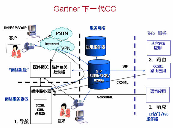 根據(jù)上圖,Gartner認為下一代呼叫中心基于SIP架構(gòu),SIP開放特性將賦予呼叫中心系統(tǒng)更多的接入方式和應(yīng)用,其中CCXML和VXML的應(yīng)用尤為突出。