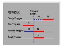 、中間觸發(fā)(middle-trigger)及后觸發(fā)(post-trigger)。其觸發(fā)點與所采集到數(shù)據(jù)的關系如下圖所示: