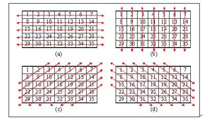 以對數(shù)據(jù)的位置重新排列方法,如圖1.1所示,假設其中的一個子圖皆為一張檔案大小5*7的圖文件,則在”位置重新排列”的方法中,其先對檔案數(shù)據(jù)作左右方向位置的調(diào)換,如圖1.1(a);再將經(jīng)過左右方向轉換的檔案數(shù)據(jù),作上下方向位置的調(diào)換,如圖1.1(b);再將經(jīng)過左右方向與上下方向轉換的檔案數(shù)據(jù),作右上左下方向位置的調(diào)換,如圖1.1(c);最后在將經(jīng)過前三個方向轉換的檔案數(shù)據(jù),作左上右下方向位置的調(diào)換,如圖1.1(d)。因此,其對于每一張圖檔都在四種方位上對數(shù)據(jù)作位置上的對調(diào),如此才完成一張圖檔的加密過程。并且在任何一個方向上,對數(shù)據(jù)作轉換的方向與點數(shù)都是不固定的,其完全依照隨機的方式,并有產(chǎn)生隨機方向與點數(shù)的機制。此種方法,僅針對檔案中的數(shù)據(jù)調(diào)換位置,即將數(shù)據(jù)位置作重新排列,此舉并不會改變到檔案中每一個數(shù)據(jù)內(nèi)容的值。