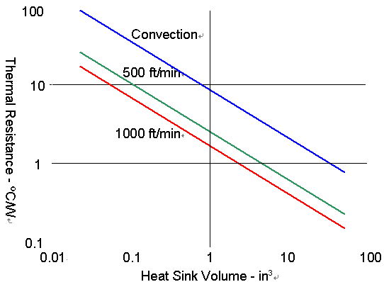 從圖上可以看出散熱片的散熱能力并不和風(fēng)速成一線性函數(shù),在熱阻上一個非常顯著的改善,會在稍呈對流狀態(tài)的空氣與每分鐘500英尺的風(fēng)速情況下顯現(xiàn)出來,但是從每分鐘500英尺增加到每分鐘1000英尺的風(fēng)速時,熱阻的改善就沒那么顯著了。另一個用吹風(fēng)方式的限制因素是噪音,當(dāng)吹過卡板與散熱片的風(fēng)速增加時,所產(chǎn)生的噪音也會增加。從實(shí)務(wù)面來看,大部分的CompactPCI機(jī)箱提供每分鐘300英尺的風(fēng)速,如先前提到的,散熱片通常會被內(nèi)存以及PMC的空間給限制了大小,一個CompactPCI卡板若含有兩個PMC的設(shè)計(jì),通常會有一個處理器散熱片的大小約為3