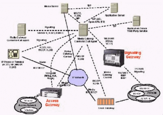本例中的媒體網(wǎng)關(guān)控制器(MGC)終結(jié)所有的信令,包括直接傳輸?shù)暮屯ㄟ^IP的信令,完成如一個SIP電話向PSTN網(wǎng)絡(luò)發(fā)送信號之類的信令互通,還對打到VoIP網(wǎng)絡(luò)的呼叫進(jìn)行鑒權(quán)和選擇路由,并提供計(jì)費(fèi)信息。這個MGC還通過SIP/SIP-T,H.323或Q.BICC與其他的MGC通信。