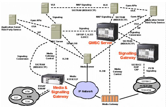 在這個例子中媒體和信令網(wǎng)關(guān)(Media & Signalling Gateway)、移動交換中心網(wǎng)關(guān)服務(wù)器(GMSC Server)、拜訪位置寄存器(VLR)、歸宿位置寄存器(HLR)都集成了信令網(wǎng)關(guān)的功能,它們分別起到無線接入網(wǎng)的信令網(wǎng)關(guān)和漫游信令網(wǎng)關(guān)的作用。獨(dú)立設(shè)置的信令網(wǎng)關(guān)(Signalling