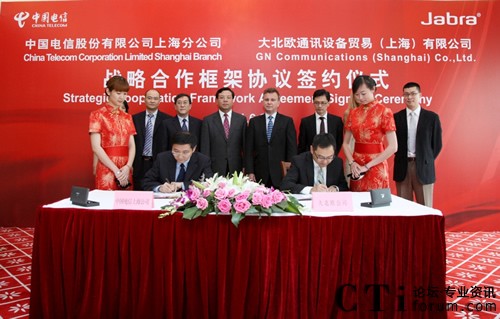 CTI論壇(ctiforum)6月23日消息(記者 楊佳林):上!蝾I(lǐng)先的創(chuàng)新耳麥解決方案提供商大北歐公司(GN Netcom)與中國電信上海公司(以下簡稱上海電信)今日隆重舉辦了 “戰(zhàn)略合作框架協(xié)議簽約儀式”。上海電信資深經(jīng)理花銳強(qiáng)、大北歐公司亞太區(qū)總裁Mark Leigh,及雙方公司高層領(lǐng)導(dǎo)共同出席了此次慶典。Mark Leigh先生還代表了大北歐公司將Edouard Suenson先生——“將電報(bào)引入中國的丹麥人”的雕像捐贈給上海電信博物館,見證了中國與丹麥源于19世紀(jì)末在通信方面的成功合作。