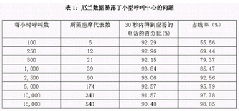 這張厄蘭表生動(dòng)地說明了當(dāng)呼叫中心規(guī)模增長是其效率的迅速增長。這張表對(duì)應(yīng)的情況是這樣的:處理每一個(gè)呼叫的平均時(shí)間是2分鐘。要實(shí)現(xiàn)的目標(biāo)是90%的呼叫要在30秒內(nèi)得到應(yīng)答。第一列顯示了呼叫量的增長,第二列顯示了相對(duì)于特定的呼叫量,為達(dá)到指定的服務(wù)水平,在該厄蘭模型下所需的最少座席代表數(shù)。