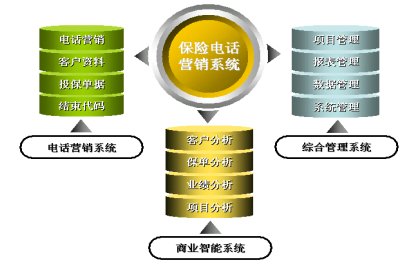 保險電話營銷系統(tǒng)從功能上分為電話營銷、綜合管理以及商業(yè)智能三大子系統(tǒng)。其功能結構圖如下: