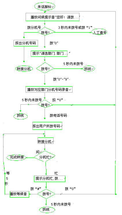 話務(wù)員不需要說話, 系統(tǒng)在所有必要之處都有提示音, 話務(wù)員只要在數(shù)字鍵盤上鍵入部門號"0××"和電話號碼"2××"。