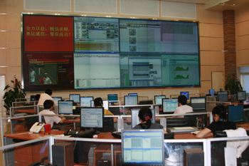 上海貝爾阿爾卡特工程師在公司設立在北京的奧運保障指揮部緊張工作