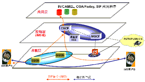 VPN等。圖中以移動(dòng)分組網(wǎng)的承載方式為例,描述了IMS用戶通過(guò)手機(jī)進(jìn)行IMS會(huì)話的方式,主要的承載層設(shè)備有SGSN、GGSN,以及媒體網(wǎng)關(guān)MGW。SGSN和GGSN可以完全重用現(xiàn)網(wǎng)設(shè)備,不需要硬件升級(jí),僅通過(guò)做相關(guān)配置就可以支持IMS了。MGW是負(fù)責(zé)媒體流在IMS域和CS域互通的功能實(shí)體,主要解決話音互通問題。無(wú)論具體采用哪一種接入方式,只要基于IP技術(shù),所有的IMS用戶信令就可以很好地傳送到控制層。