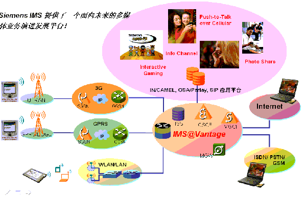 西門子IP多媒體子系統(tǒng)名為IMS@vantage,它完全遵循3GPP規(guī)范,提供了一個(gè)支持語(yǔ)音/多媒體數(shù)據(jù)業(yè)務(wù)集成的開放式網(wǎng)絡(luò)控制平臺(tái),能為運(yùn)營(yíng)商以最經(jīng)濟(jì)快捷的方式提供多媒體應(yīng)用及開發(fā)環(huán)境。