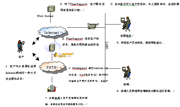 FineSupportTM網(wǎng)通呼叫中心解決方案主要由以下幾個(gè)部分組成:Media Gateway(接受來自IP網(wǎng)的網(wǎng)絡(luò)電話、傳統(tǒng)電話等呼叫,傳送給軟交換系統(tǒng))、Service Switch(軟交換系統(tǒng),負(fù)責(zé)呼叫控制)、IP IVR(存儲(chǔ)顧客呼叫信息,播放語(yǔ)音提示信息)、Soft ACD(呼叫分配服務(wù)器,可定制多種分配策略)、Web Server(負(fù)責(zé)報(bào)表管理、站點(diǎn)管理和監(jiān)控、FAQ存儲(chǔ)管理、留言及文本交談管理等)、Chat Server(建立交談通道)、Remote Agent(坐席工作站。通過客戶端軟件進(jìn)行客服支持)。