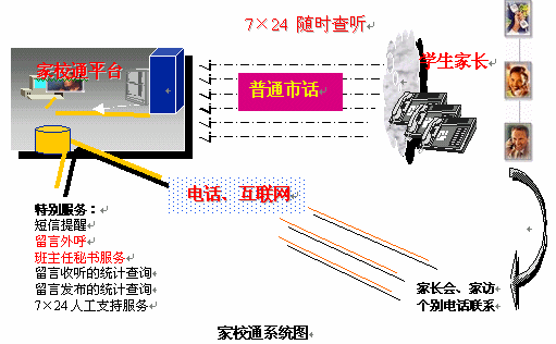 捷通華聲從關(guān)愛青少年成長(zhǎng)出發(fā),提出了應(yīng)用于教育領(lǐng)域溝通平臺(tái)"家校通"系統(tǒng)的語(yǔ)音服務(wù)解決方案。家校通系統(tǒng)是一個(gè)融合了語(yǔ)音合成、計(jì)算機(jī)網(wǎng)絡(luò)集成綜合服務(wù)、互聯(lián)網(wǎng)、數(shù)據(jù)庫(kù)等多種先進(jìn)IT技術(shù)為一體的新一代家校聯(lián)系工具。它充分利用互聯(lián)網(wǎng)與目前最為普及的公眾電話等資源,為學(xué)校提供多樣化的信息發(fā)布渠道,同時(shí)強(qiáng)大的7×24小時(shí)的留言發(fā)布和查聽服務(wù)功能,為老師和家長(zhǎng)提供一種全新、高效、便捷的交流方式,大大提高了家長(zhǎng)的滿意度,提升了學(xué)校的管理實(shí)力。