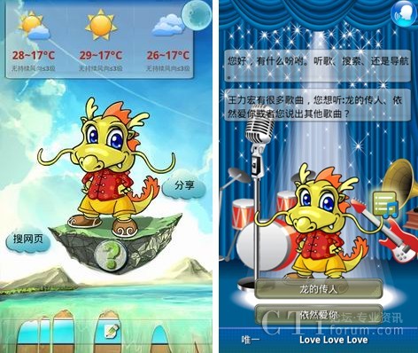聰明、善解人意的小唐龍基于開(kāi)放的Android操作系統(tǒng),在捷通華聲全球首個(gè)全方位智能人機(jī)交互(HCI)感知云-靈云平臺(tái)的支持下,會(huì)學(xué)習(xí),善思考,能說(shuō)會(huì)聽(tīng),能寫會(huì)識(shí)。此次正式發(fā)布的小唐龍界面更加清新亮麗,令人耳目一新;獨(dú)一無(wú)二的語(yǔ)音與手寫全方位人機(jī)交互,讓用戶在任何情況下都可以無(wú)障礙的使用小唐龍;重新構(gòu)建設(shè)計(jì)的音樂(lè)播放的界面,增加歌詞顯示功能,讓用戶隨心所欲的添加、刪除、選擇、演唱歌曲;新聞播報(bào)清晰自然,流暢動(dòng)聽(tīng),新聞內(nèi)容更加豐富,讓天下大事隨時(shí)都掌握在用戶手中;地圖查詢實(shí)現(xiàn)全國(guó)范圍方便快捷的導(dǎo)航、公交查詢、餐飲服務(wù);全國(guó)地區(qū)天氣預(yù)報(bào)等功能的完善,給用戶的生活帶來(lái)的極大的便利。全新小唐龍讓手機(jī)助手之名更加名副其實(shí)!