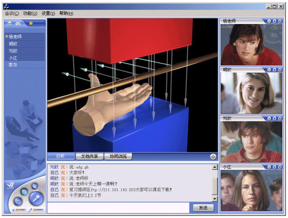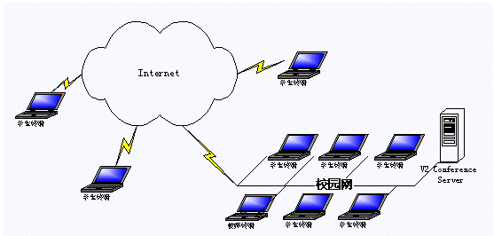 應(yīng)用V2 遠(yuǎn)程教育平臺(tái),教學(xué)和遠(yuǎn)程培訓(xùn)都可以在線進(jìn)行。學(xué)生和教師利用各自的客戶端通過網(wǎng)絡(luò),進(jìn)入一個(gè)虛擬課堂,在教師與學(xué)生、學(xué)生與學(xué)生之間建立起語音和視頻的雙向交流、課件教學(xué)、在線會(huì)話和白板溝通的環(huán)境,實(shí)現(xiàn)教學(xué)功能。