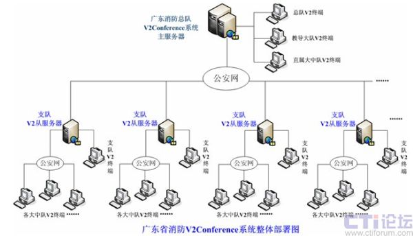 整體系統(tǒng)采用服務(wù)器級聯(lián)架構(gòu)部署,在總隊網(wǎng)絡(luò)中心部署了主服務(wù)器,全省各地市21個支隊,每個支隊部署1臺v2從服務(wù)器,與總隊主服務(wù)器進行級聯(lián),所有從服務(wù)器下面每個大、中隊分別作為一個終端節(jié)點接入支隊從服務(wù)器,教導(dǎo)大隊及總隊直屬特勤大隊直接接入總隊服務(wù)器,所用傳輸線路為總隊現(xiàn)有的公安網(wǎng)絡(luò)資源。通過目前整個v2系統(tǒng)的部署完成了廣東消防全省300多點終端會場的同時接入,在這個遠程教育系統(tǒng)平臺之上,可以同時召開總隊對支隊的會議,支隊對所屬大中隊的會議,多點即時交流會議,會議和會議之間互不影響,獨立開展。在大數(shù)量終端同時參與同一會議時,V2conference系統(tǒng)的級聯(lián)功能可以有效地將服務(wù)器資源進行整合,以適應(yīng)更大規(guī)模的會議應(yīng)用,并通過多服務(wù)器來均衡整體系統(tǒng)壓力,使系統(tǒng)更加穩(wěn)定。
