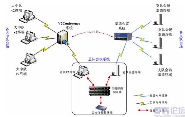 另外在廣東省消防信息系統(tǒng)內(nèi),現(xiàn)有硬件泰德電視電話會議系統(tǒng)共有23個終端節(jié)點,主要基于獨立的IP專用網(wǎng)絡(luò),并與V2conference系統(tǒng)所在IP網(wǎng)絡(luò)相互獨立。為了達到和硬件系統(tǒng)共用互通,實現(xiàn)全網(wǎng)會議互通,在總隊會議系統(tǒng)中,將會議系統(tǒng)一級網(wǎng)(省公安廳——消防總隊)、二級網(wǎng)(消防總隊——支隊)、三級網(wǎng)(消防支隊——消防大中隊)通過消防總隊會議控制系統(tǒng)和v2conference系統(tǒng)自帶的H.323互通功能模塊融合到一起。