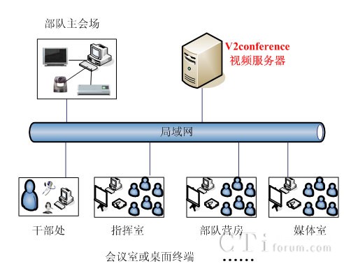 V2視頻會議系統(tǒng)建立在森警部隊(duì)專網(wǎng)的基礎(chǔ)上,各區(qū)作戰(zhàn)部隊(duì)會議室、指揮室和部隊(duì)營房會議均為光纖100M接入,每個中隊(duì)官兵營房都集中建立了培訓(xùn)會議室,負(fù)責(zé)日常新兵的培訓(xùn)教育。在現(xiàn)有的網(wǎng)絡(luò)基礎(chǔ)上構(gòu)建了V2視頻會議系統(tǒng),來滿足各個中隊(duì)和教導(dǎo)大隊(duì)的網(wǎng)絡(luò)會議和培訓(xùn)需求。在每個節(jié)點(diǎn)會議室部署了電視、攝像頭和相關(guān)音響設(shè)備,目前已經(jīng)建成10多個網(wǎng)絡(luò)會議節(jié)點(diǎn)的遠(yuǎn)程視頻培訓(xùn)系統(tǒng)。