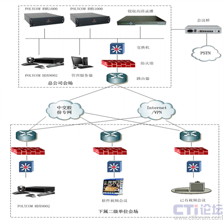 在信息高度發(fā)達(dá)的今天,企業(yè)辦公網(wǎng)絡(luò)化、自動(dòng)化和信息共享已成為衡量一個(gè)企業(yè)現(xiàn)代化管理水平的標(biāo)志。隨著中交集團(tuán)信息化的發(fā)展,急需一套視頻會(huì)議系統(tǒng)實(shí)現(xiàn)總部和下屬公司之間的及時(shí)的信息溝通。經(jīng)過對(duì)自身使用需求、特點(diǎn)的分析,中交集團(tuán)決定直接選用業(yè)界最新的視頻會(huì)議高清標(biāo)準(zhǔn)建設(shè),而且要和集團(tuán)二級(jí)單位已構(gòu)建的品牌不一的標(biāo)清系統(tǒng)互連。