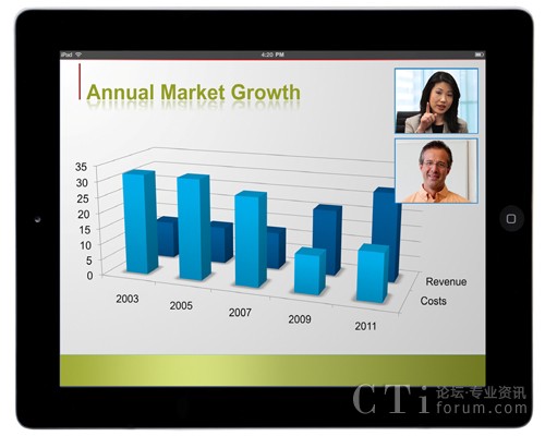 - 直接與企業(yè)目錄相連,幫助用戶通過點擊姓名即可進行視頻通話(已在iPad2實現(xiàn),并很快在Android設(shè)備中實現(xiàn))。