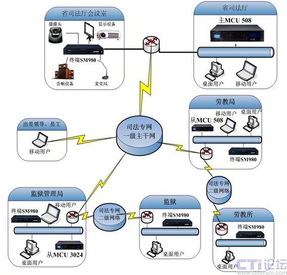MCU 508),部署在省司法廳信息中心機(jī)房;在監(jiān)獄管理局和勞教局各部署1臺從MCU(一臺SM MCU 508+一臺SM