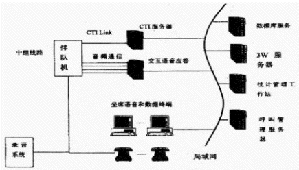 中型呼叫中心:人工座席在50~100之間的呼叫中心稱為中型呼叫中心。中型呼叫中心PBX與CTI服務(wù)器、人工座席直接相連,人工座席又與應(yīng)用服務(wù)器相連,客戶資料存儲(chǔ)在應(yīng)用服務(wù)器中,應(yīng)用服務(wù)器實(shí)時(shí)地將打入電話的客戶的資料自動(dòng)地在計(jì)算機(jī)屏幕上彈出,使座席人員能及時(shí)獲得相應(yīng)信息。CTI服務(wù)器一般由CTI硬件開發(fā)商的板卡和PC組成。