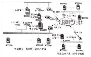 為推進金融行業(yè)的金融電子化進程,并充分利用中國國家金融數(shù)據(jù)通信網(wǎng)(CNFN)的資源,中國人民銀行天津大區(qū)行于1999年建立了首個運行在CNFN上的基于IP的H.323電視會議網(wǎng),實現(xiàn)了華北范圍內(nèi)天津、內(nèi)蒙古、河北、山西兩省一區(qū)一市的36家人民銀行機構(gòu)的會議電視聯(lián)網(wǎng)。VCON公司提供的基于IP的H.323視頻會議第四代解決方案在該系統(tǒng)中發(fā)揮了重要作用。