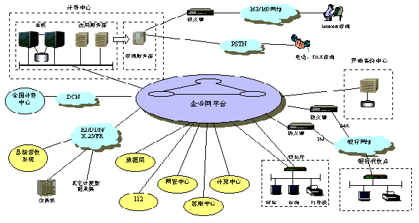 縣計(jì)費(fèi)中心采用64K DDN連接各營業(yè)廳和支局,縣銀行通過銀行網(wǎng)絡(luò)連入企業(yè)網(wǎng)平臺(tái),鄉(xiāng)鎮(zhèn)代收點(diǎn)視具體條件的不同可采用DDN、ISDN或PSTN方式連入計(jì)費(fèi)中心。
