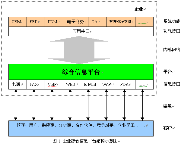 企業(yè)綜合信息平臺是一個完全從客戶出發(fā),并能更好地為客戶服務(wù)的一個平臺。這里我們所指的“客戶”是一個廣義的概念,綜合信息平臺的客戶不僅包括企業(yè)的客戶、用戶,而且還包括企業(yè)內(nèi)部的員工、企業(yè)的供應(yīng)商、分銷商及合作伙伴,甚至還包括企業(yè)的競爭對手。綜合信息平臺,保證了企業(yè)內(nèi)部之間、企業(yè)與客戶之間的信息流得到暢通、高效的處理,可以高效、高質(zhì)量地為客戶服務(wù),提高客戶的滿意度和忠誠度,同時使企業(yè)內(nèi)部的信息實現(xiàn)共享,并能支撐企業(yè)信息化各環(huán)節(jié)對客戶數(shù)據(jù)的依賴,為企業(yè)信息化建設(shè)提供了一個開放性的平臺。
