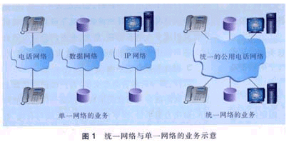 。1)數(shù)據(jù)和話音的融合進一步促進電話網(wǎng)絡(luò)、數(shù)據(jù)網(wǎng)絡(luò)與IP網(wǎng)絡(luò)的融合。一個統(tǒng)一的網(wǎng)絡(luò)提供各類業(yè)務(wù)顯然比各類網(wǎng)絡(luò)提供各自的業(yè)務(wù)要大大提高運營和服務(wù)的效率,如圖1所示。
