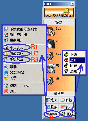 圖3:DICO主窗口及在線狀態(tài)和個性設(shè)置按鈕
