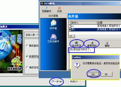 3、點按主窗口下方的"覓友"按鈕,彈出的對話框中選擇三種添加方式之一后按"下一步"進行好友的添加;當有人加你為好友時,系統(tǒng)會有提示音閃并DICO圖標在任務(wù)欄不斷閃爍,你點擊上來后會彈出你的DICO郵箱對話框并收到有某某加你為好友的消息,此時可先點按"查看資料"了解一下來人相關(guān)信息;若有意可點按"加產(chǎn)好友"加來訪者為好友(下圖7)。