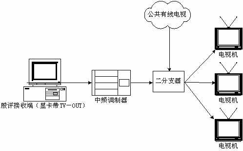 本系統(tǒng)接收端接收實時廣播時,除了用普通PC機收看,或把PC機接收到的信號輸?shù)诫娨暎ù笃粒┥鲜湛矗踔吝可以接入有線電視網(wǎng)進(jìn)行播放。具體方法是通過一個接收端接收股評節(jié)目,通過帶TV-OUT的顯卡把TV信號輸出到中頻調(diào)制設(shè)備,中頻調(diào)制設(shè)備可以把基帶模擬信號轉(zhuǎn)換成一個有線電視信號,且傳輸距離遠(yuǎn),損失小,再把這個信號與有線電視信號一起接入一個二分支器(2進(jìn)1出),這就可以和公共有線電視共存,形成自己的頻道,供電視接收。