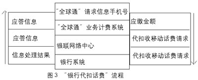 “銀行代扣話費(fèi)”方式 對于“由非銀行端發(fā)起,但需銀行代扣收的交易”,其執(zhí)行通過多種接入方式(如手機(jī)短消息、GPRS、客戶服務(wù)中心、自助終端、因特網(wǎng)等)提交信息,內(nèi)容包括“全球通”手機(jī)號、“神州行”手機(jī)號、IP電話卡號、付費(fèi)金額、銀行賬戶、密碼、交易類型等。