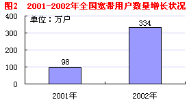 易觀咨詢的電信分析師顧先立說,固網(wǎng)市場的飽和與移動通信對固網(wǎng)的替代使得中國電信、中國網(wǎng)通這兩家固網(wǎng)運營商向新業(yè)務(wù)求助,主要是由DSL(數(shù)據(jù)用戶線)技術(shù)推動的寬帶接入業(yè)務(wù)來帶動整體收入的增長;而且,運營商希望能通過寬帶接入向用戶提供將來能帶來更多收入的增值業(yè)務(wù)。在前述動機和積極推廣下,2000年起,寬帶用戶數(shù)大幅增長。截至2002年底,全國4850萬互聯(lián)網(wǎng)用戶中有334萬寬帶用戶,而2001年底為98萬用戶數(shù),去年凈增236萬。中國電信2002年顯示,其寬帶用戶增長了98.2萬,達到137.9萬,較2001年底增長247.4%。今年,中國電信集團和中國網(wǎng)通的目標(biāo)是總共增加370萬寬帶用戶,達到700萬。