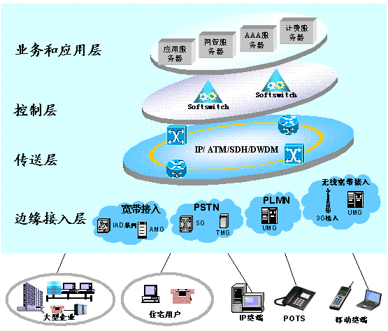 滿足多樣化、個(gè)性化業(yè)務(wù)需求,使服務(wù)質(zhì)量得到保證,令用戶滿意。運(yùn)營(yíng)商可以推出新的盈利模式,實(shí)現(xiàn)按質(zhì)論價(jià)、優(yōu)質(zhì)優(yōu)價(jià)。普通用戶可通過(guò)智能分組話音終端、多媒體終端接入,通過(guò)接入媒體網(wǎng)關(guān)、綜合接入設(shè)備(IAD)來(lái)滿足用戶的語(yǔ)音、數(shù)據(jù)和視頻業(yè)務(wù)的共存需求。