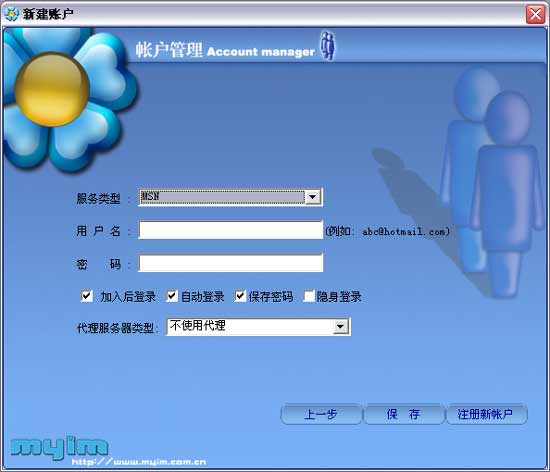 先添加相應(yīng)的賬戶;點擊"添加新賬戶"按鈕,彈出"賬戶管理"頁面,在"服務(wù)類型"的下拉列表中選擇相應(yīng)的服務(wù)類型,再依次輸入用戶名和密碼;設(shè)定完成后點擊"保存"即完成新賬戶的添加;保存完畢后myim自動返回登錄界面。