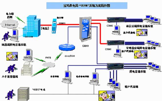⑵ 利用現(xiàn)有的計(jì)算機(jī)網(wǎng)絡(luò)基礎(chǔ)實(shí)現(xiàn)市區(qū)供電分局、寶雞縣供電分局、鳳縣供電分局三個(gè)供電分局與局客戶(hù)服務(wù)中心的信息聯(lián)結(jié);
