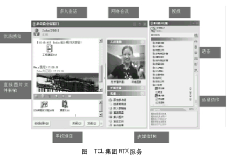 RTX產(chǎn)品支持標(biāo)準(zhǔn)的SIP、H.323 IP電話協(xié)議,并采用高質(zhì)量的QoS技術(shù)保證實(shí)時(shí)通信網(wǎng)絡(luò)質(zhì)量,使得TCL集團(tuán)公司的用戶可以與同事之間采用語(yǔ)音或者視頻的面對(duì)面的交流(如圖),相當(dāng)于給集團(tuán)公司的任何一位RTX用戶配備了一部集成的視頻和語(yǔ)音電話。目前這項(xiàng)服務(wù)在集團(tuán)公司非常受歡迎,尤其是遠(yuǎn)程的代表處和集團(tuán)總部之間的信息交流更直接、更快捷,在一定程度上取代了電話的功能,大大節(jié)約了通信費(fèi)用。比如,TCL空調(diào)的計(jì)劃部每天需要和全國(guó)20多個(gè)代表處的計(jì)劃處進(jìn)行數(shù)據(jù)往來(lái),以前需要電話完成的功能現(xiàn)在通過(guò)RTX的即時(shí)文字、短信和語(yǔ)音對(duì)講完成,大大提高效率,節(jié)省了通信成本。